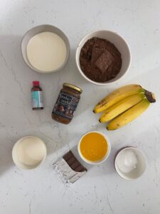 - Make ganache with 150 g semi-dark chocolate and 160 ml cream. Stir until smooth. Pour over bananas. Chill until set.