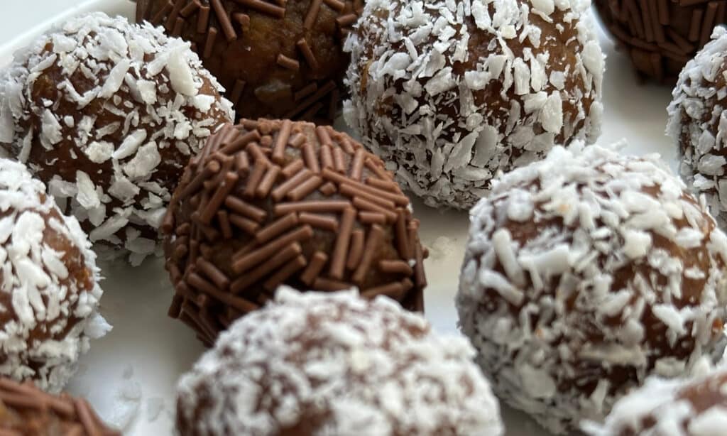 5. Roll each ball in desiccated coconut or chocolate sprinkles. Coat them well for a neat finish.