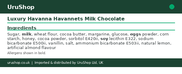 Ingredients: Sugar, milk, wheat flour, cocoa butter, margarine, glucose, eggs powder, corn starch, honey, cocoa powder, sorbitol E420ii, soy lecithin E322, sodium bicarbonate E500ii, vanillin, salt, ammonium bicarbonate E503ii, natural lemon, artificial almond flavour