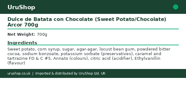 Ingredients: Sweet potato, corn syrup, sugar, agar-agar, locust bean gum, powdered bitter cocoa, sodium bonzoate, potassium sorbate (preservatives), caramel and tartrazine FD & C #5, Annato (colours), citric acid (acidifier), Ethylvanillin (flavour)