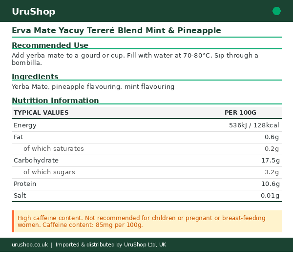 Ingredients: Yerba Mate, lemon flavouring, pineapple flavouring Erva mate Yacuy Tereré blend with Mint & Pineapple 500g