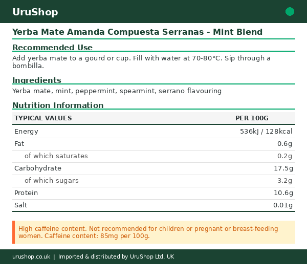 Ingredients: Yerba mate, mint, peppermint, spearmint, serrano flavouring