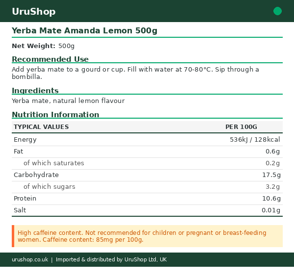 High caffeine content. Not recommended for children or pregnant or breast-feeding women. Caffeine content: 85mg per 100g.