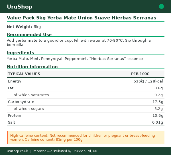 Union Suave is an important Argentine brand of yerba mate, specialising in a smoother blend. This delicious blend of yerba mate and valley mints is fragrant and refreshing. โHierbas serranasโ literally translates as โvalley herbsโ