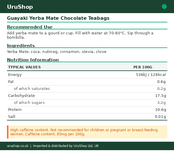 High caffeine content. Not recommended for children or pregnant or breast-feeding women. Caffeine content: 85mg per 100g.