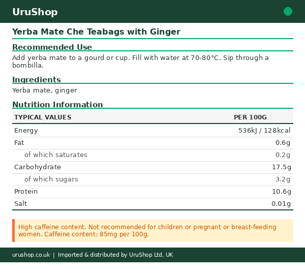 High caffeine content. Not recommended for children or pregnant or breast-feeding women. Caffeine content: 85mg per 100g.